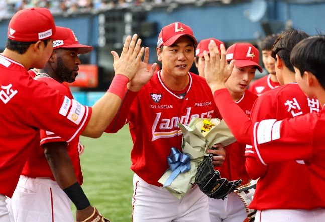 SSG 선발 김광현은 5이닝 7피안타 무사사구 3탈삼진 3실점으로 시즌 8승(9패)째를 챙겼다.