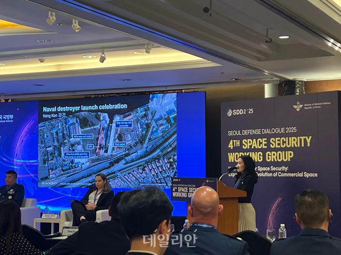 린 샤샤인(Lyn SHASSAGNE) 블랙스카이 시장진출 총괄 선임 부사장이 8일 2025 서울안보대화 우주안보워킹그룹에서 발표하고 있다. ⓒ데일리안 맹찬호 기자