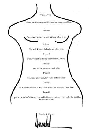 또 편지에는 여성의 나체를 나타내는 듯한 윤곽선이 그려져 있고 그 위에 제프리와 도널드가 대화하는 식의 문장들이 적혀 있다. 그 아래 트럼프 대통령의 풀네임(도널드 J. 트럼프)이 있고 Donald라는 서명도 있다. AP는 대화 형식의 메시지를 컴퓨터로 작성해 인쇄한 뒤 그림을 그린 것으로 보인다고 보도했다.