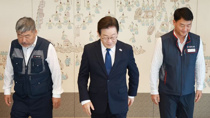 이재명 대통령이 지난 4일 서울 용산 대통령실 청사에서 열린 양대노총 위원장과의 오찬 간담회에 참석해 김동명 한국노총 위원장, 양경수 민노총 위원장과 기념촬영을 마친 뒤 자리로 향하고 있다. 왼쪽부터 김동명 한국노총 위원장, 이 대통령, 양경수 민노총 위원장 ⓒ연합뉴스