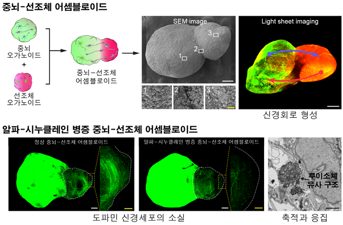 연구팀은 인간 전분화능 줄기세포(human pluripotent stem cell; hPSC)를 활용해 중뇌 오가노이드(중뇌 신경세포 기능을 모사한 3차원 뇌 모델)와 선조체 오가노이드(운동 조절과 학습에 중요한 선조체의 특성을 모사한 3차원 뇌 모델)를 각각 제작한 뒤 이를 융합해, 실제 인간 뇌의 신경회로를 정밀하게 재현한 '인간 중뇌-선조체 어셈블로이드(human striatal-midbrain assembloid; hSMA, 다종의 뇌오가노이드를 결합해 만든 융합 미니 뇌 모델)'를 확립했다고 10일 밝혔다.