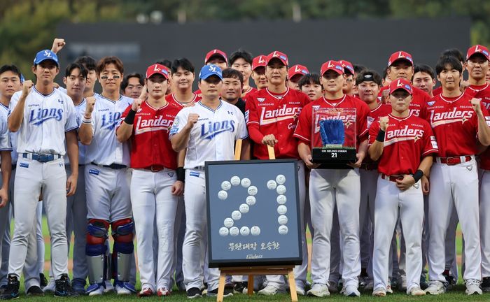 SSG는 11일 대구 삼성라이온즈파크에서 열린 삼성과의 시즌 마지막 맞대결을 앞두고 오승환을 위해 준비한 선물을 전달했다.