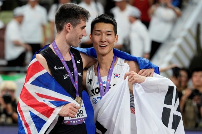 우상혁은 16일 일본 도쿄 국립경기장에서 펼쳐진 ‘2025 도쿄 세계육상선수권대회’ 남자 높이뛰기 결선에서 2m34를 넘어 2위에 올랐다.