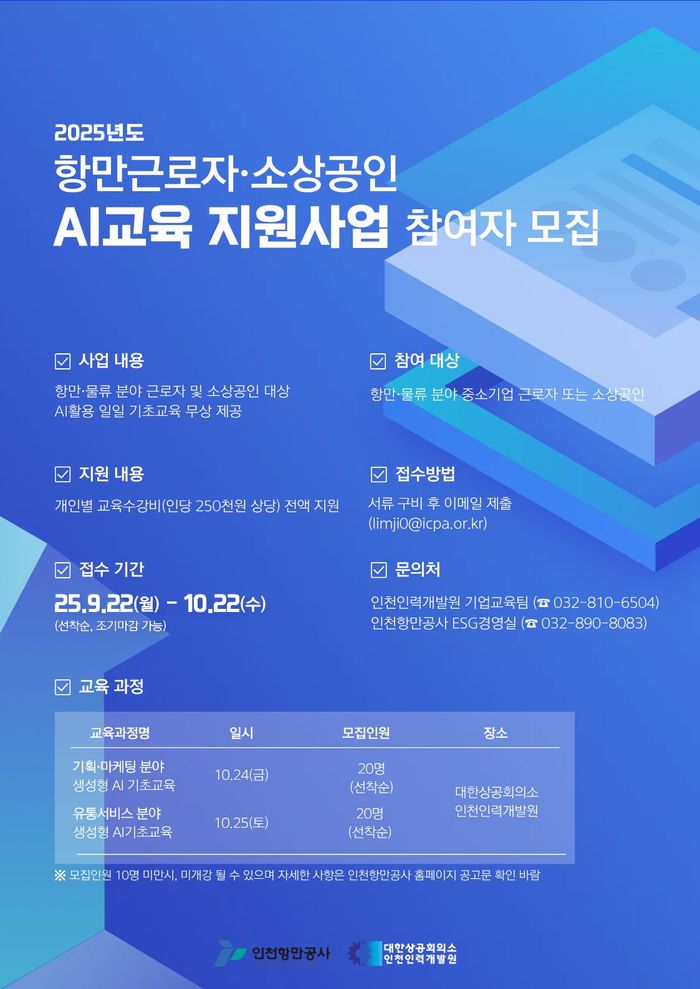 교육 신청자 모집은 22일부터 다음 달 22일까지 약 한 달간 선착순으로 접수하며, 일일 교육형태로 대한상공회의소 인천인력개발원의 강의실에서 진행된다.