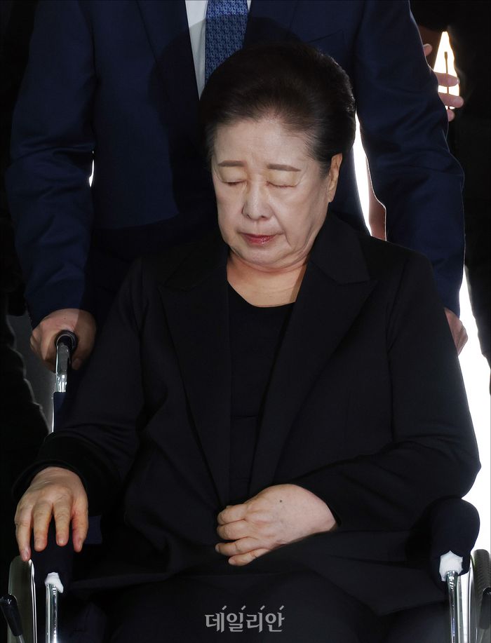 한학자 통일교 총재가 22일 오후 서울 서초구 서울중앙지방법원에서 열린 구속전피의자심문(영장실질심사)에 출석하고 있다. 한 총재는 권성동 국민의힘 의원에게 불법 정치자금을 전달한 혐의 등을 받고 있다.