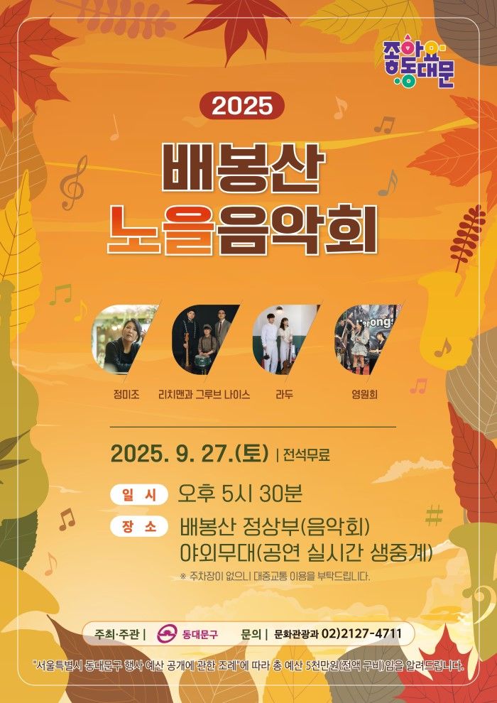 올해 첫 선을 보이는 이번 음악회는 동대문구의 대표 명소인 배봉산 정상에서 열린다. 저무는 노을과 함께 재즈와 보사노바의 아름다운 선율을 즐길 수 있는 야외공연으로, 관객들에게 한층 더 깊고 감성적인 가을 저녁을 선사할 예정이다.