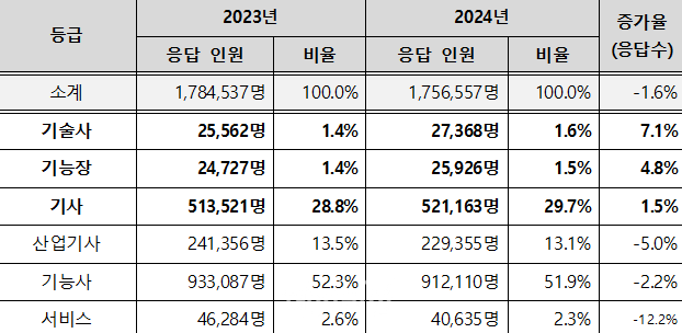 등급별로는 기술사 응답 수가 전년 대비 7.1%로 가장 큰 폭으로 증가했다. 기능장과 기사는 각각 4.8%, 1.5% 늘었다.