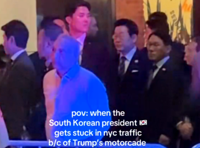 이재명 대통령이 미국 뉴욕 유엔총회 참석 기간 중 맨해튼 한복판에서 도널드 트럼프 미국 대통령의 차량 행렬에 가로막혀 잠시 발이 묶인 모습이 포착됐다.