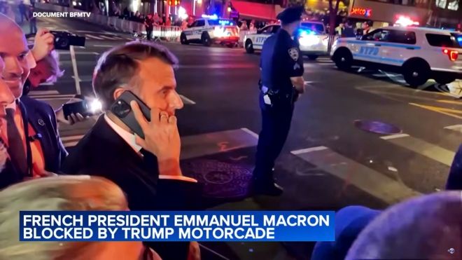 마크롱 프랑스 대통령은 22일 맨해튼 한복판에서 트럼프 대통령의 차량 행렬에 갇혔다. 이에 마크롱 대통령은 트럼프 대통령에게 직접 전화를 걸어 "당신 때문에 길이 막혀서 기다리고 있다"며 농담조로 말했다. 이후 마크롱 대통령은 수행단과 함께 도보로 30분가량을 이동한 것으로 전해졌다.