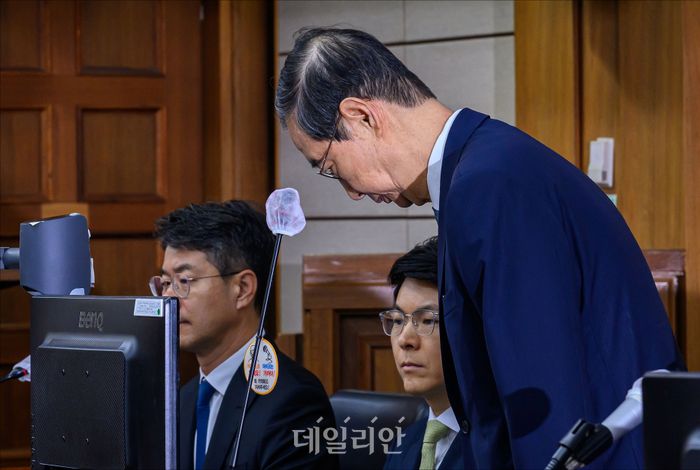 '내란 방조' 혐의로 특검에 기소된 한덕수 전 국무총리가 30일 오전 서울 서초구 서울중앙지방법원에서 열린 첫 공판에 출석하고 있다.