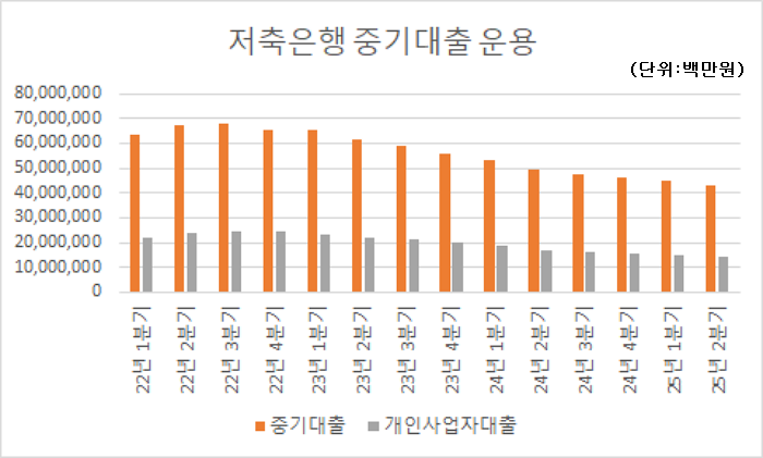 저축은행업계는 지난 2022년 3분기(68조1971억원) 이후 중기대출 규모를 줄여왔다. 개인사업자 대출도 같은 시기(24조4843억원) 이후 11분기 연속 감소세를 이어가고 있다.