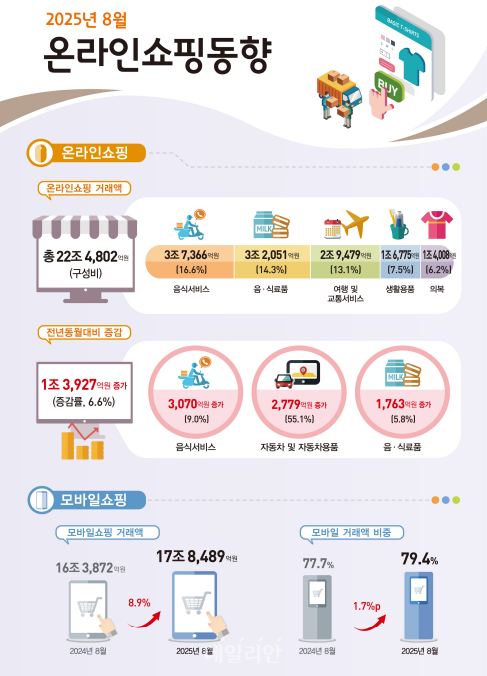 최창윤 국가데이터처 서비스업동향과장은 “최근 배달 플랫폼 경쟁이 심화된 가운데, 공공배달앱에서 민생회복 소비쿠폰을 사용할 수 있게 되면서 음식서비스 온라인쇼핑 거래액이 크게 늘었다”며 “올해 상반기 수입 전기차 신제품이 많이 출시되면서 자동차 및 자동차용품 부분도 증가했다”고 밝혔다.