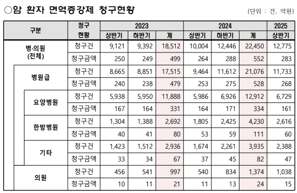 1일 국회 정무위원회 소속 김재섭 국민의힘 의원이 금융감독원으로부터 제출받은 자료에 따르면 병·의원의 암 환자 대상 면역증강제 청구 건은 2023년 상반기 9121건에서 올해 상반기 1만2775건으로 40.1% 증가했다.