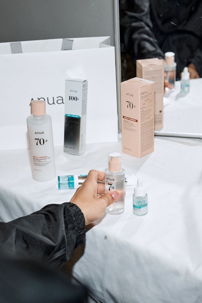 이번 쇼의 스킨케어 프렙 단계에는 아누아 PDRN 라인 3종(세럼, 크림, 마스크팩)과 라이스 라인 2종(토너, 세럼)이 사용됐다. 두 라인 모두 촉촉한 사용감과 풍부한 보습력으로 메이크업의 완성도를 높여주는 것이 특징이다.