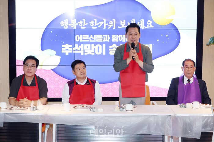 장동혁 국민의힘 대표가 추석 명절 연휴가 시작되는 2일 오전 서울 동대문구 동백꽃노인종합복지관에서 열린 '추석맞이 송편빚기' 봉사활동에서 인사말을 하고 있다.