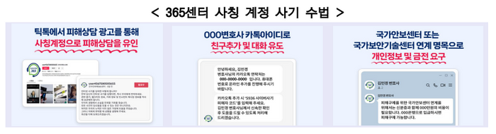 주요 사기수법은 틱톡 등 온라인관계망(SNS)에서 365센터 사칭 계정을 통해 피해상담 광고를 올려 이용자들을 유인한 후, 피해자가 상담요청을 하면 365센터 소속 변호사를 사칭한 특정인의 연락처를 알려주며 피해자에게 접근한다.