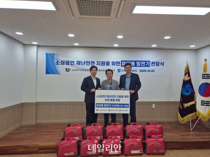 한국전기안전공사는 2일 전북 전주시 전북상인연합회관에서 소상공인 재난 안전을 위한 휴대용 발전기 대여 증정식을 열었다.