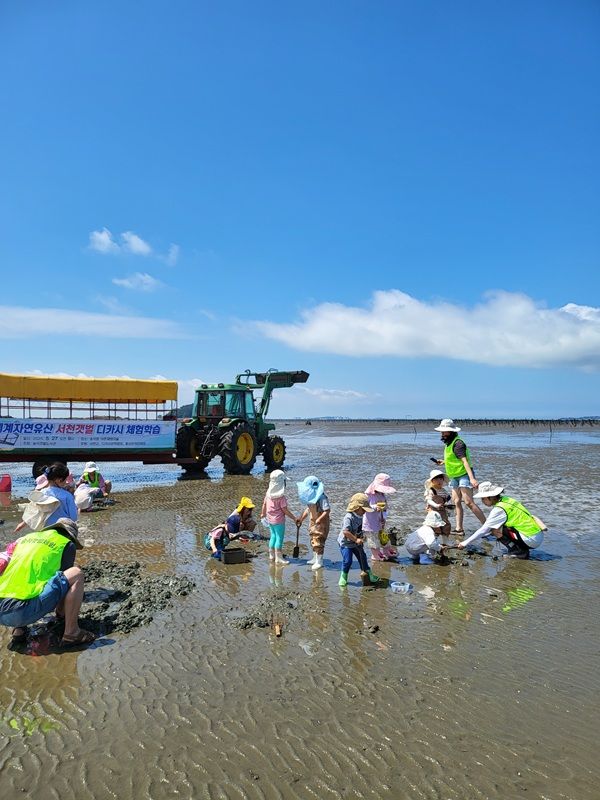 충남 서천군 월하성 마을은 얕은 수심과 고운 모래펄에서 바지락·모시조개를 관찰하며 갯벌 생물 체험을 즐길 수 있다.