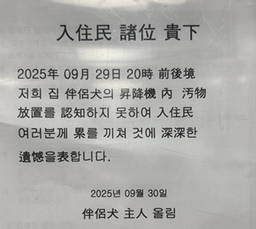 이후 견주는 입주민 관리센터 직원의 권유로 직접 사과문을 작성해 엘리베이터 안에 붙였다. 하지만 사과문은 온통 한자로 "저희 집 반려견의 승강기 내 오물 방치를 인지하지 못해 입주민 여러분께 누를 끼친 것에 심심한 유감을 표합니다"라고 작성돼 논란을 더욱 키웠다.