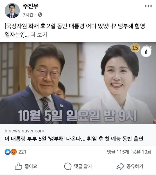 그는 오는 5일 이재명 대통령 내외가 출연한 ‘냉장고를 부탁해’가 방송된다며 “촬영은 1주일 전쯤이었을 것이다. 국정자원 화재 발생 그 무렵이다”고 주장했다.