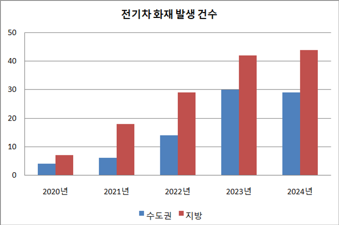 지난해의 경우 수도권에서 29건의 전기차 화재가 발생하는 동안, 지방에서는 44건이 발생했다. 2023년에는 수도권에서 30건이 발생하는 사이, 지방에서는 42건이 발생했다.