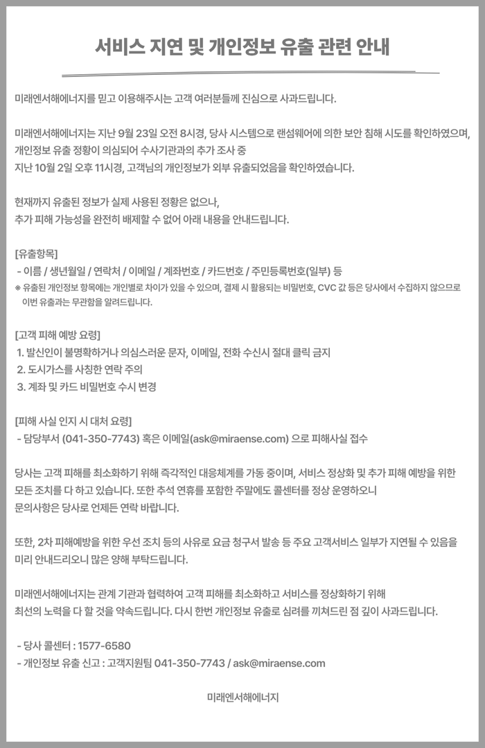 미래엔서해에너지는 "개인정보 유출 사태로 심려를 끼쳐드린 점 깊이 사과드린다"며 "고객 피해를 최소화하고, 서비스 정상화를 앞당기기 위해 최선을 다하겠다"고 밝혔다.