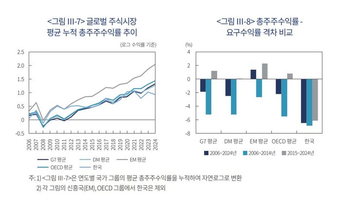 특히 "타 국가 대비 높은 요구수익률과 낮은 실현수익률의 지속적 격차는 할인율이 구조적으로 높게 형성되어 있음을 보여주는 징후"라며 "한국 시장의 만성적인 저PBR(주가순자산비율) 현상을 설명하는 단서로 해석된다"고 강조했다.