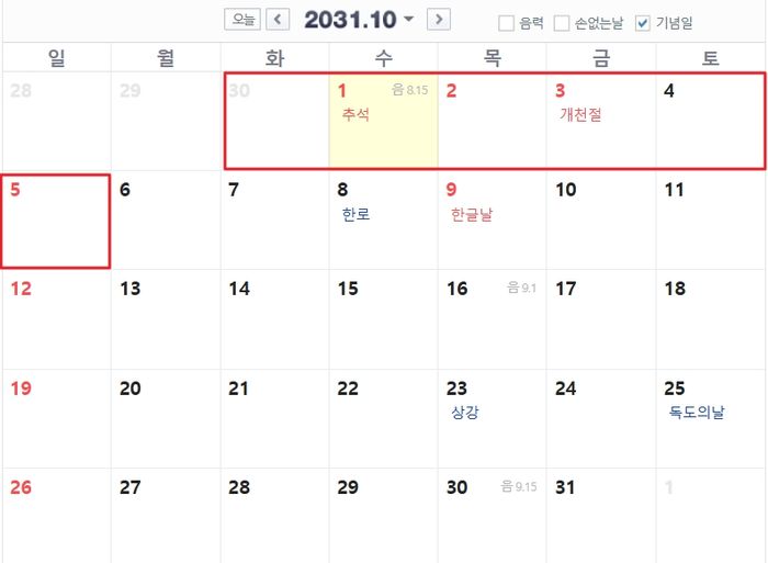 2031년 추석은 10월 1일로 추석 연휴는 9월 30일부터 10월 2일까지다. 금요일인 3일이 개천절이라서 주말 포함 6일간 쉴 수 있다.