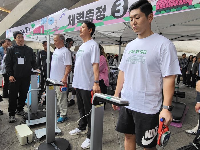 이날 행사에는 오세훈 서울시장을 비롯해 김재섭 국민의힘 국회의원, 황규석 서울시의사회 회장, 방송인 조나단·패트리샤 남매 등이 참석해 체력측정에 나섰다.