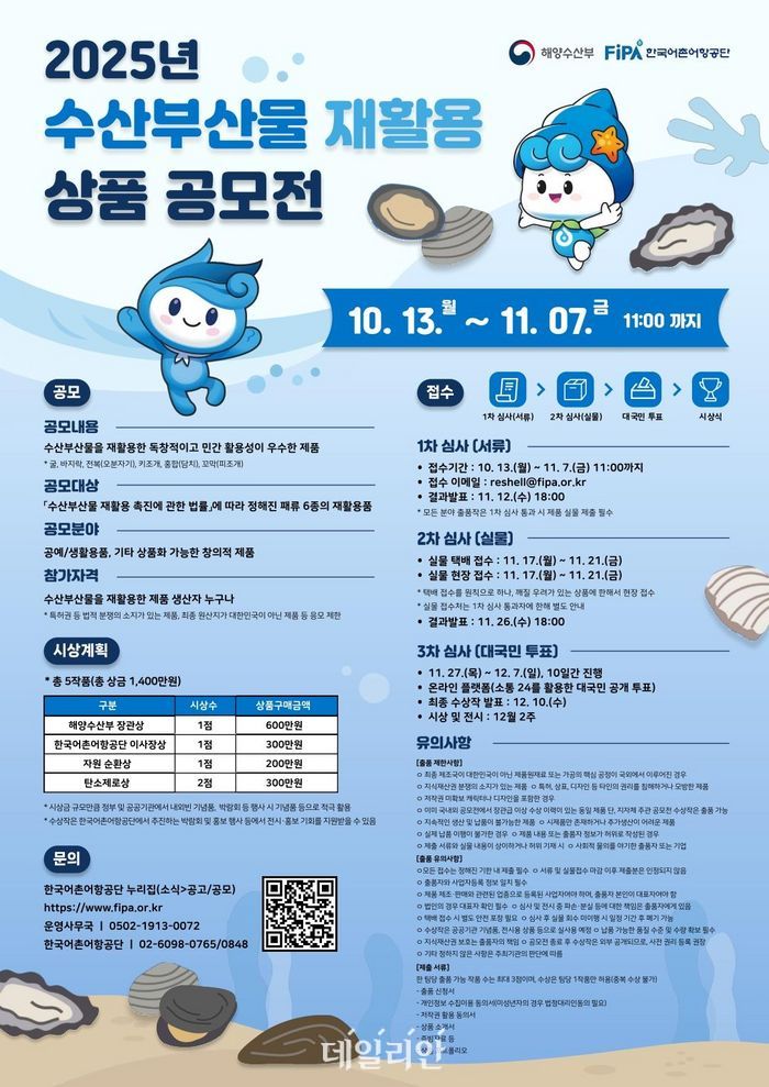 해양수산부와 한국어촌어항공단은 오는 13일부터 내달 7일까지 굴, 바지락, 전복(오분자기 포함), 키조개, 홍합, 꼬막(피조개 포함) 등 패류 6종의 수산부산물을 활용한 2025년 수산부산물 재활용 상품 공모전을 개최한다.