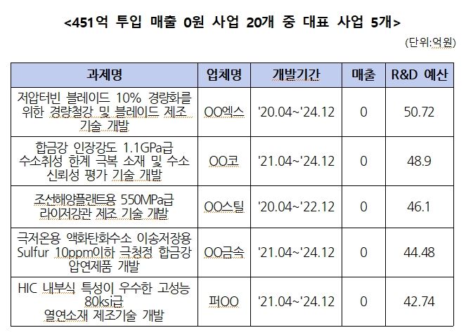 매출이 0원인 사업은 대표적으로 OO엑스가 2020년 4월부터 2024년 12월까지 진행한 '저압터빈 블레이드 10% 경량화를 위한 경량철강 및 블레이드 제조 기술 개발' 사업으로, 정부 예산 50억7200만원이 투입됐다.