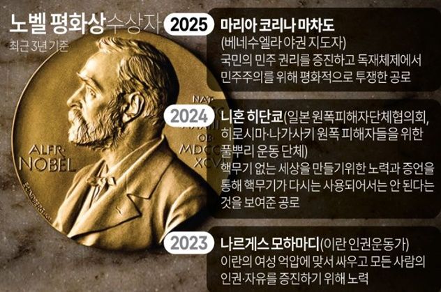 올해 노벨 평화상은 베네수엘라 독재 정권에 맞서 민주화 운동을 주도해온 여성 정치인 마리아 코리나 마차도(58)가 선정됐다.