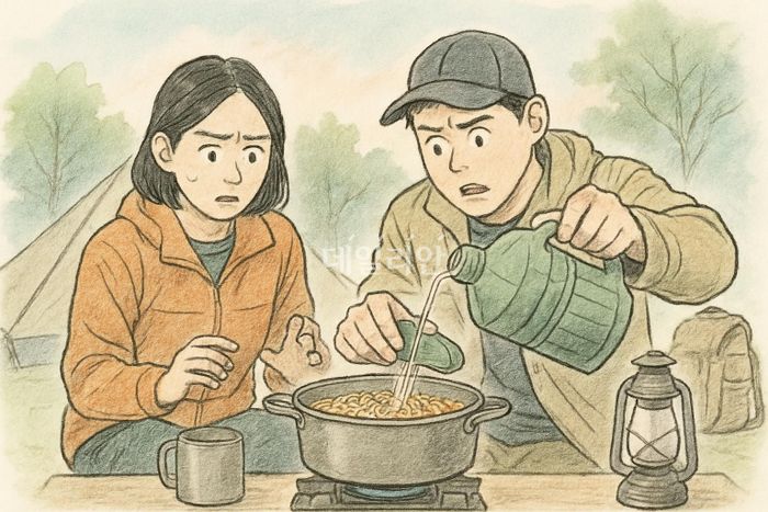 경기 광주시의 한 캠핑장에서 랜턴 연료 등으로 사용하는 파라핀 오일을 물로 착각해 라면을 끓여먹은 일행이 병원으로 옮겨졌다.ⓒ데일리안 AI 삽화 이미지