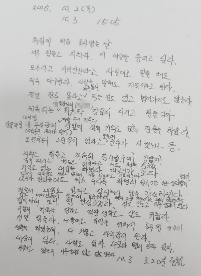 해당 메모에는 "모른다고 기억 안 난다고, 사실대로 말해도 계속 다그친다. 사실을 말해도 거짓이라고 한다" "계속되는 회유와 강압에 지치고 힘들다가 강압적인 10시경 수사관의 강압에 전혀 기억도 없는 진술을 했다" 등 특검 조사 과정이 담겼다.