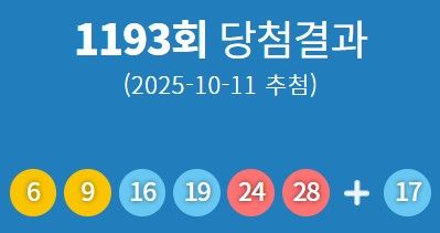 11일 동행복권은 제1193회 로또 당첨번호가 '6·9·16·19·24·28'번이라고 밝혔다. 보너스 번호는 17번이다.