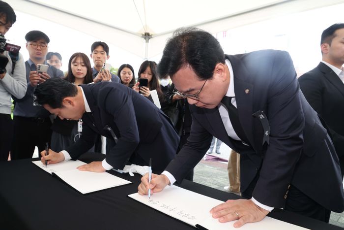 국회 인근 마련된 양평군 공무원 추모 분향소서 헌화·묵념