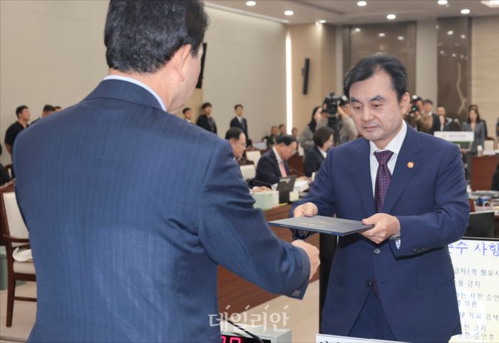 안규백 국방부 장관이 13일 서울 용산구 국방부 청사에서 열린 국회 국방위원회 국방부 등에 대한 2025 국정감사에서 선서문을 전달하고 있다.