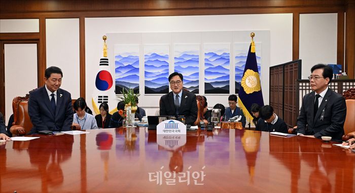 우원식 국회의장이 13일 서울 여의도 국회에서 열린 국회의장 주재 여야 원내대표 회동에서 발언을 하고 있다.