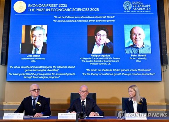 올해 노벨 경제학상은 창의적 혁신과 경제성장의 관계를 연구한 조엘 모키어(79) 미국 노스웨스턴대 경제학과 교수와 필리프 아기옹(69) 영국 런던정경대(LSE) 경제학과 교수, 피터 하윗(79) 미국 브라운대 경제학과 교수가 수상의 영예를 안았다.