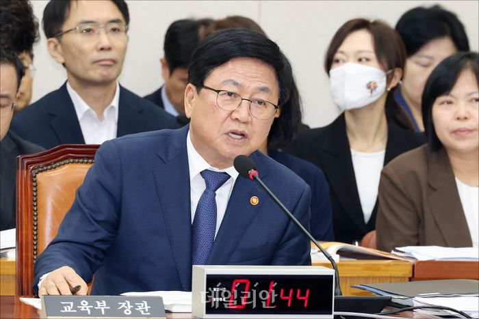 최교진 교육부 장관이 14일 서울 여의도 국회에서 열린 국회 교육위원회 교육부 등에 대한 2025 국정감사에서 질의에 답변하고 있다.