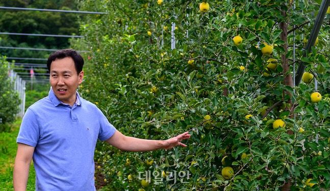 뜨거운 한여름, 지난 8월 5일 오전 8시 경북 군위군의 한 사과밭에 황금빛 설렘이 영글고 있었다. 신품종 여름사과 ‘골든볼’의 첫 수확 현장이었다.