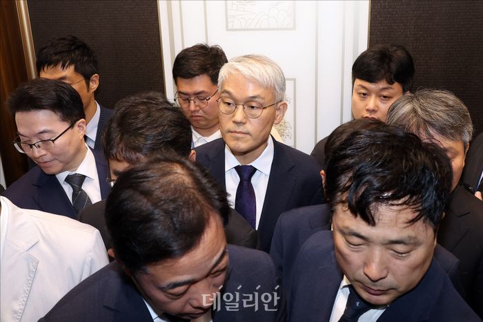 천대엽 법원행정처장이 15일 서울 서초구 대법원에서 열린 국회 법제사법위원회의 대법원에 대한 2025 국정감사에서 더불어민주당 등 여권 감사위원들이 현장검증을 위해 이동한 뒤 엘리베이터에 탑승해 이동하고 있다.