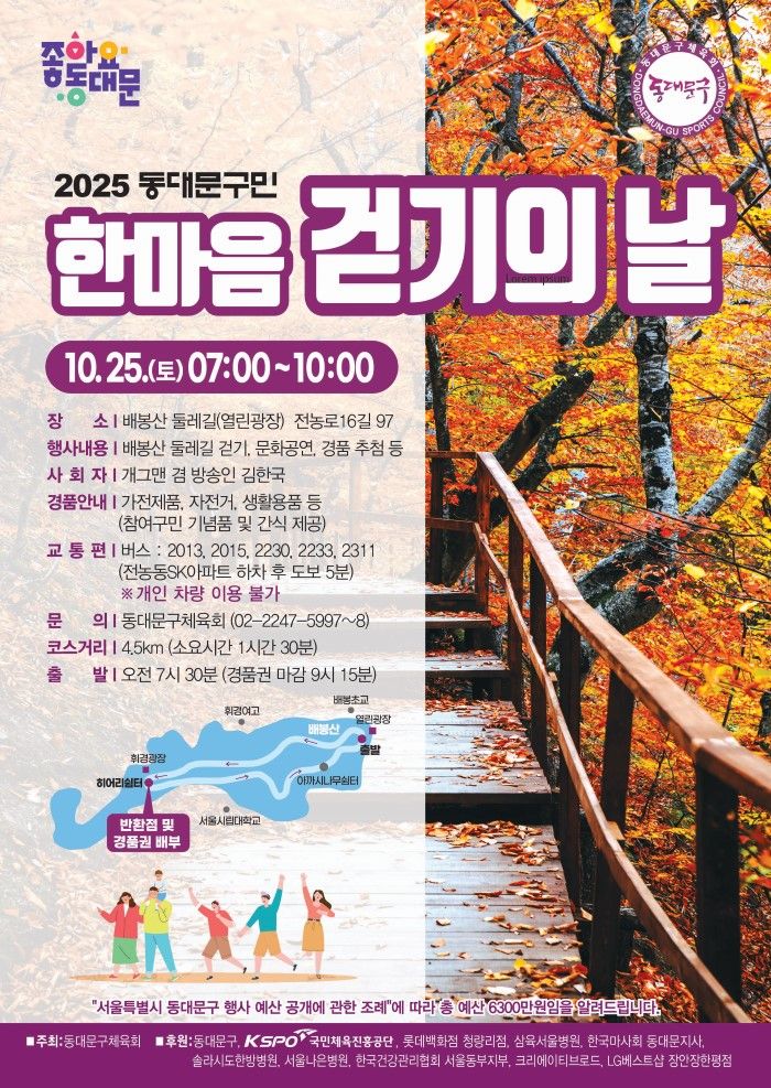 서울 동대문구(구청장 이필형)는 구민 모두가 함께 걷고 웃으며 건강을 챙길 수 있는 '2025년 하반기 동대문구민 한마음 걷기의 날'을 오는 25일(토) 오전7시 배봉산 둘레길에서 개최한다고 15일 밝혔다.