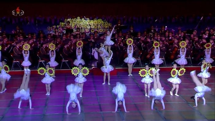 북한이 관광 상품으로 활용할 정도로 자부심을 갖는 대집단체조(매스게임) 공연도 전파를 탔으며, 서커스를 방불케 하는 묘기도 이어졌다.