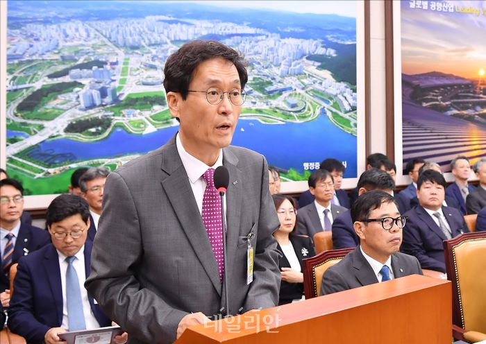 함진규 한국도로공사 사장이 16일 서울 여의도 국회에서 열린 국회 국토교통위원회의 한국도로공사 등에 대한 2025 국정감사에서 업무보고를 하고 있다.