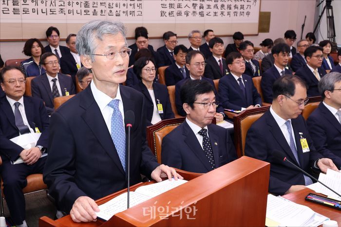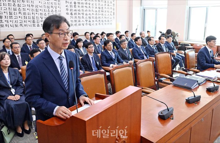최재해 감사원장이 16일 서울 여의도 국회에서 열린 국회 법제사법위원회의 감사원에 대한 2025 국정감사에서 업무보고를 하고 있다.