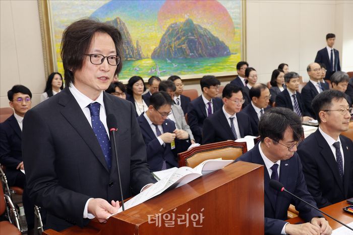 주병기 공정거래위원장이 14일 서울 여의도 국회에서 열린 국회 정무위원회 공정거래위원회 등에 대한 2025 국정감사에서 업무보고를 하고 있다.