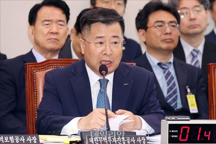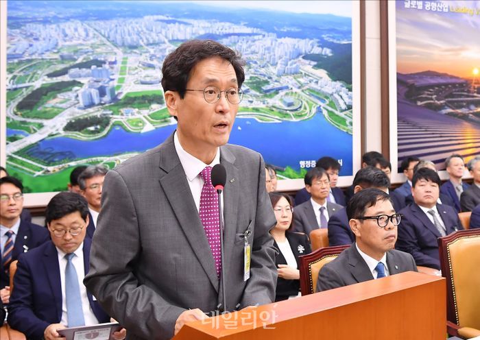 강경성 대한무역투자진흥공사(KOTRA) 사장이 16일 서울 여의도 국회에서 열린 국회 산업통상자원중소벤처기업위원회의 대한무역투자진흥공사 등에 대한 2025 국정감사에서 질의에 답변하고 있다.