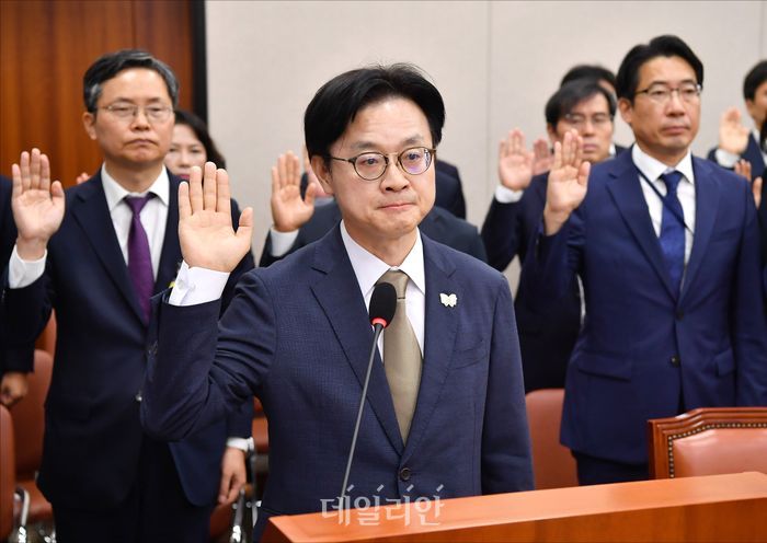 김영훈 고용노동부 장관이 15일 서울 여의도 국회에서 열린 국회 기후에너지환경노동위원회의 고용노동부에 대한 2025 국정감사에서 증인선서를 하고 있다.