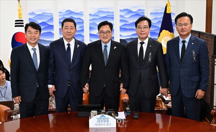 우원식 국회의장과 여야 원내대표가 13일 서울 여의도 국회에서 열린 국회의장 주재 여야 원내대표 회동에서 기념촬영을 하고 있다. 왼쪽부터 더불어민주당 문진석 원내운영수석부대표, 김병기 원내대표, 우원식 의장, 국민의힘 송언석 원내대표, 유상범 원내운영수석부대표.